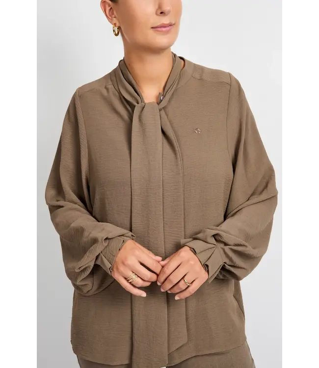 De elegante Lillith blouse is een losvallend model met een opstaande kraag, doorknoopsluiting en een speels strikdetail dat je op verschillende manieren kunt stylen. De wijde mouwen met manchetten zorgen voor extra volume en een moderne touch. Combineer met een pantalon voor een sophisticated look of draag met denim voor een casual-chique uitstraling.