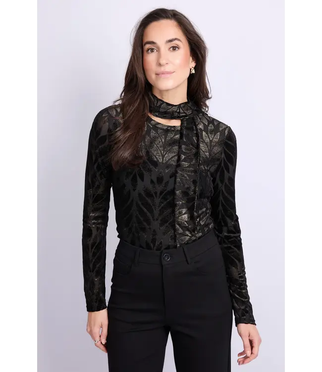 De Tina top is een chique mesh top met een glanzend bladmotief dat zorgt voor een luxe, feestelijke uitstraling. De top heeft een hoge hals met een los strikdetail en lange mouwen, wat het item een vrouwelijke en verfijnde touch geeft. Perfect te dragen met een pantalon voor een stijlvolle avondlook of met een rok voor een moderne, feestelijke outfit.