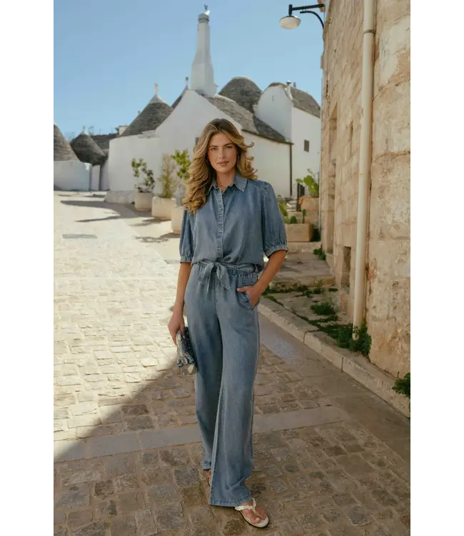 De Laira blouse is een tijdloze denim blouse met een stoere en vrouwelijke uitstraling. Het model heeft een klassieke kraag, een knoopsluiting en driekwart mouwen met een subtiel pofeffect, wat zorgt voor een moderne twist. De verfijnde details op de schouders geven de blouse een speels en elegant karakter, terwijl de soepelvallende denimstof zorgt voor een comfortabele pasvorm.