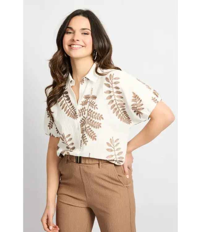De Lina blouse is een blouse met een verfijnde print die zorgt voor een vrouwelijke uitstraling. Het model heeft een klassieke kraag, een knoopsluiting en korte mouwen, wat zorgt voor een tijdloos en draagbaar silhouet. De subtiele bladprint geeft de blouse een uniek accent, terwijl de soepelvallende stof comfortabel draagt.