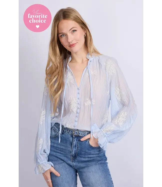 De Lyra blouse is een verfijnde blikvanger met een romantische twist. Het semi-transparante materiaal en het subtiele borduursel creëren een luchtige, vrouwelijke uitstraling. De opstaande kraag met strikdetail en de licht geplooide mouwen met rucherand geven het ontwerp een charmante, elegante touch. Perfect te combineren met een pantalon of denim voor een stijlvolle, tijdloze look.