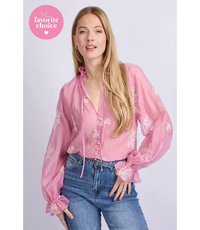 De Lyra blouse is een verfijnde blikvanger met een romantische twist. Het semi-transparante materiaal en het subtiele borduursel creëren een luchtige, vrouwelijke uitstraling. De opstaande kraag met strikdetail en de licht geplooide mouwen met rucherand geven het ontwerp een charmante, elegante touch. Perfect te combineren met een pantalon of denim voor een stijlvolle, tijdloze look.