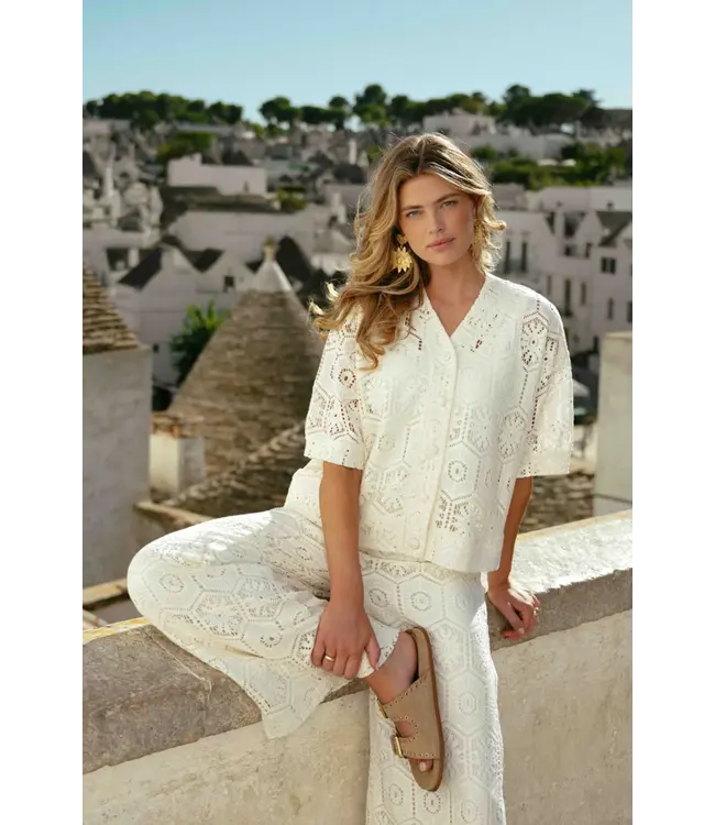 De Tola blouse is een luchtige blouse met een verfijnde en zomerse uitstraling. Het model heeft een klassieke kraag, een knoopsluiting en korte mouwen, wat zorgt voor een tijdloze en comfortabele fit. Het opengewerkte patroon geeft de blouse een elegante en speelse touch, terwijl de lichte stof mooi luchtig draagt. Perfect te combineren met een bijpassende Perina broek.