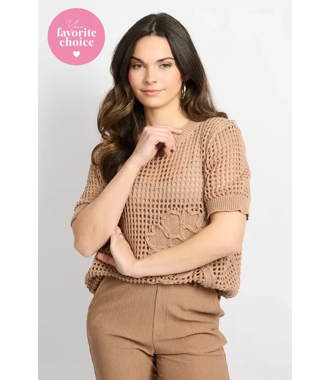 De Aivy trui is een verfijnde knit. Het model heeft een ronde hals, een normale lengte en korte mouwen, terwijl de open gebreide structuur zorgt voor een luchtig effect. De subtiele bloemapplicaties geven de trui een elegant en uniek accent. De zachte stof draagt comfortabel en maakt dit item perfect voor een stijlvolle, gelaagde look. Mooi te combineren met een pantalon voor een elegante outfit of met denim voor een frisse, casual uitstraling.