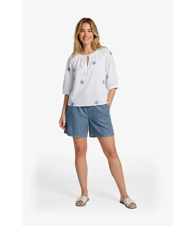 De Petrina short is een comfortabele denim short met een casual en zomerse uitstraling. Het model heeft een elastische tailleband met strikdetail en een relaxte pasvorm, wat zorgt voor een fijne en moeiteloze fit. De zachte denimstof draagt licht en comfortabel, ideaal voor warme dagen.