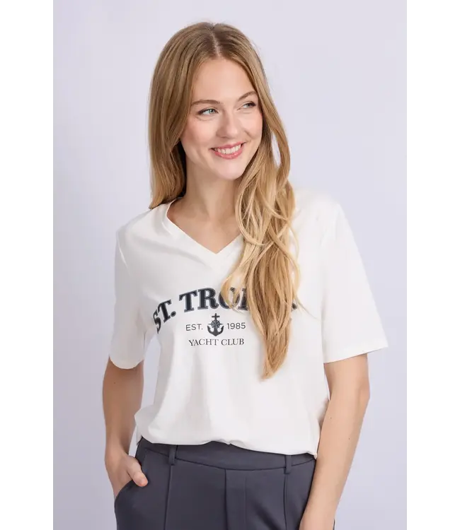 Het Tamina T-shirt brengt een vleugje Franse Riviera naar de garderobe. De opdruk met ‘St. Tropez Yacht Club’ geeft een speelse, zomerse uitstraling, terwijl de V-hals en rechte pasvorm zorgen voor een flatterend silhouet. Perfect te combineren met een denim short of linnen broek voor een nonchalante, stijlvolle look.