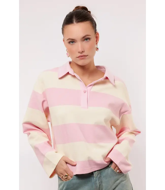 Sporty meets girly in de ZEYNA SWEATER. De brede strepen en klassieke kraag geven ‘m een rugby vibe, maar het hartvormige knoopje zorgt voor een FLURESK-touch. Combineer met een jeans en sneakers voor een playful weekendlook.