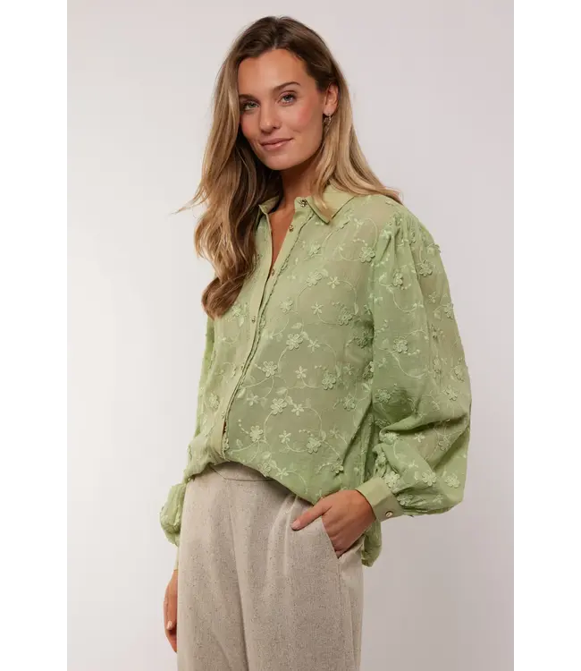 De Julieta blouse straalt verfijning en vrouwelijkheid uit dankzij de transparante stof met een rijk geborduurd bloemenpatroon dat het ontwerp een luxe uitstraling geeft. De klassieke kraag en knoopsluiting zorgen voor een tijdloos silhouet, terwijl de subtiele details en zachte volumes in de mouwen een elegante balans creëren tussen romantisch en modern. Deze blouse valt soepel om het lichaam en voelt licht en comfortabel aan, waardoor hij moeiteloos meebeweegt gedurende de dag. Een stijlvol item dat zowel casual als gekleed gedragen kan worden en elke look een elegante finishing touch geeft.