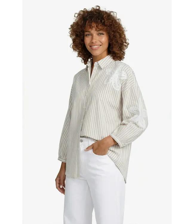 De Lumi blouse heeft een losvallende pasvorm die soepel om het lichaam valt en zorgt voor een verzorgde uitstraling. De verticale strepen geven het ontwerp een frisse en tijdloze look, terwijl de driekwart mouwen en de grote bloemapplicaties op de schouder en mouw een opvallend en vrouwelijk accent toevoegen. De klassieke kraag en knoopsluiting zorgen voor een mooie balans tussen speels en stijlvol.