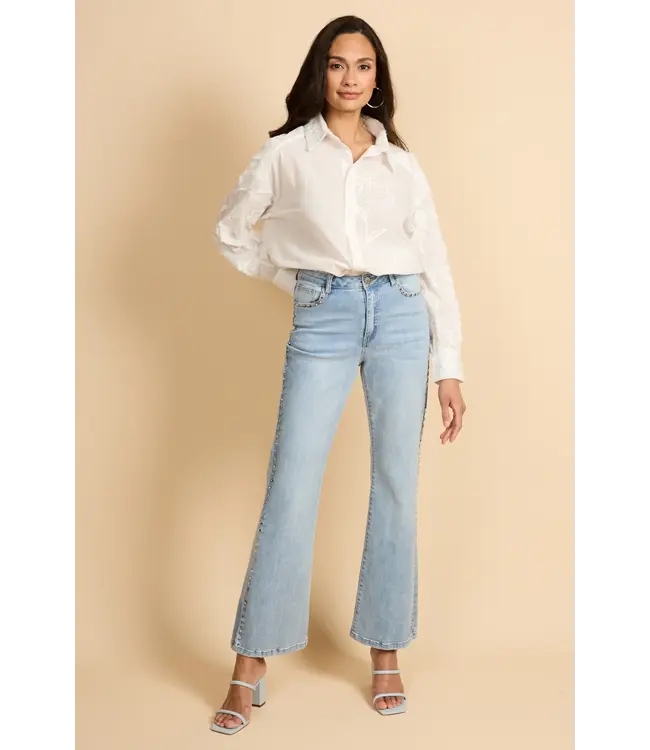 De Aminta jeans is een echte eyecatcher binnen de collectie. Het model heeft een flatterende hoge taille en een licht uitlopende pijp die zorgt voor een vrouwelijk, verlengend silhouet. De subtiele studs langs de zijnaad en rond de zakken geven de jeans een verfijnde, moderne twist zonder haar stoere karakter te verliezen. De lichte wassing maakt Aminta perfect voor het voorjaar en de zomer, terwijl de comfortabele fit ervoor zorgt dat je haar moeiteloos de hele dag draagt. Combineer met een romantische blouse of een eenvoudige top en laat de details voor zich spreken.