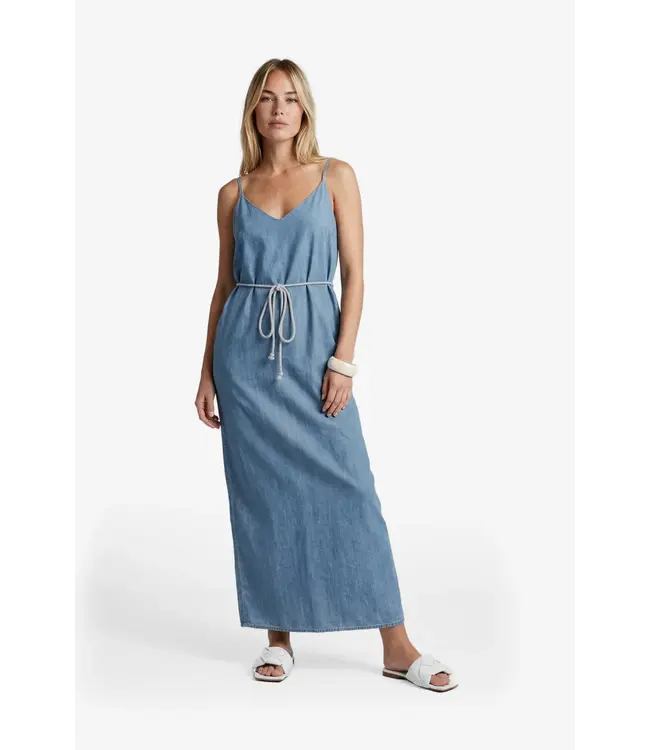 De Marita jurk heeft een soepel vallende pasvorm die elegant langs het lichaam beweegt. De smalle schouderbandjes en V-hals geven het ontwerp een verfijnde, vrouwelijke uitstraling. De denim stof zorgt voor een stoere twist, terwijl de strikceintuur in de taille de pasvorm subtiel accentueert en naar wens laat aanpassen. De stof draagt comfortabel en geeft de jurk een casual, maar verzorgde look. Draag haar met sandalen voor een relaxte uitstraling of combineer met hakken voor een meer geklede look.