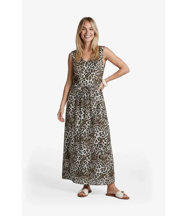 De Saffron jurk is een vrouwelijke maxi jurk met een tijdloze panterprint. Het mouwloze model heeft een elegante V-hals en een strikceintuur in de taille, waarmee je eenvoudig een mooi silhouet creëert. De soepelvallende stof beweegt luchtig met je mee en zorgt voor een comfortabele fit. Perfect voor zowel een zomerse dag als een avondlook met een hak of sandaal.