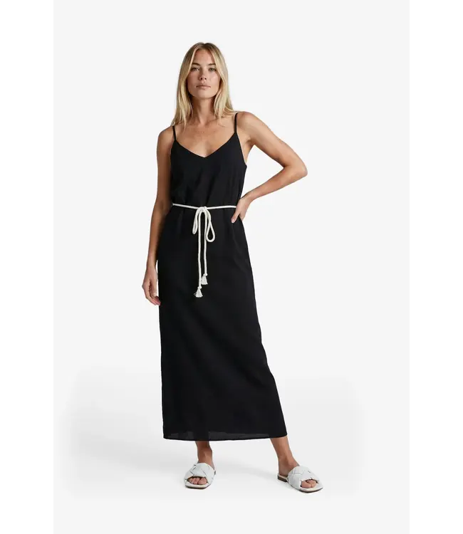 De Salla jurk heeft een soepel vallende pasvorm die het lichaam op een elegante manier volgt. De smalle schouderbandjes en de V-hals geven het ontwerp een verfijnde en vrouwelijke uitstraling, terwijl de strikceintuur in de taille zorgt voor een subtiel accent en een mooie belijning. De lange lengte en de gladde stof versterken het rustige, stijlvolle karakter. Draag de jurk met sandalen voor een minimalistische look of combineer met hakken voor een meer geklede uitstraling.