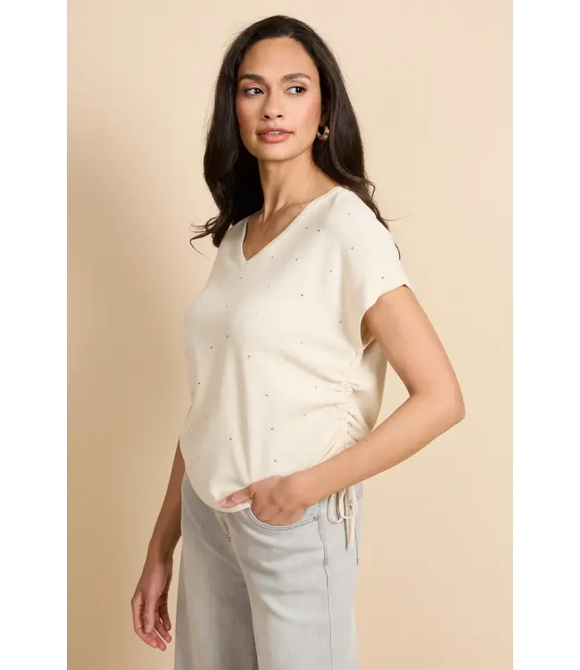 De Kiska top combineert comfort met een subtiel vrouwelijk detail. Het model heeft een soepele, licht losvallende pasvorm en is afgewerkt met een elegante V-hals en korte mouwen. De verfijnde structuur in de stof en de verstelbare strikdetails aan de zijkant geven de top een speelse, moderne touch. Mooi te dragen op een jeans voor een casual look of gecombineerd met een elegante broek voor een meer geklede uitstraling.
