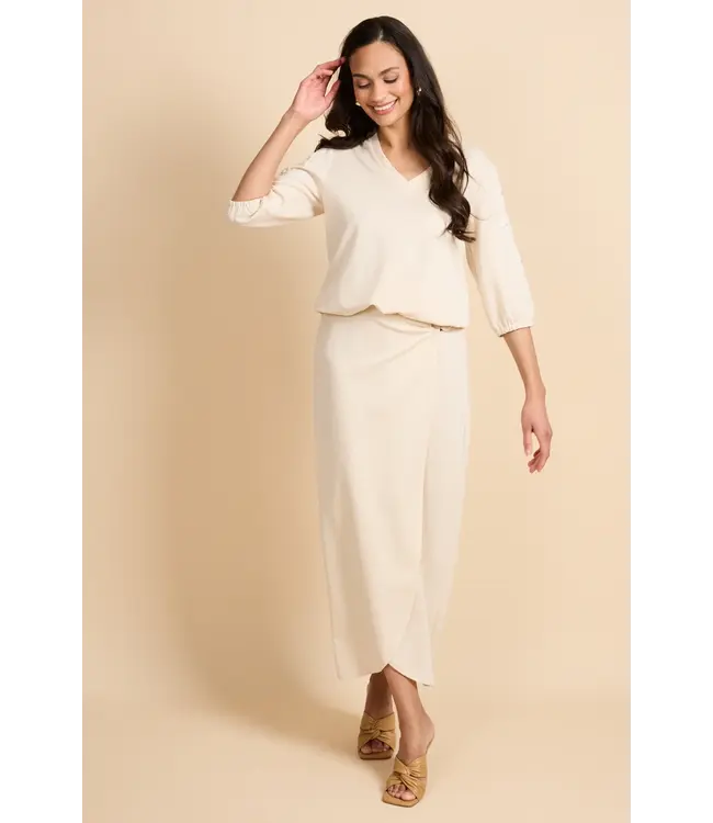 De Marilyn rok is een elegante midi rok met een vrouwelijke twist. Het model valt soepel langs het lichaam en wordt geaccentueerd door een subtiel geplooid detail met sierlijke ring op de heup. De gladde, licht stretchy stof zorgt voor een comfortabele pasvorm en een mooie, vloeiende valling. Perfect te combineren met een blouse of top voor een stijlvolle en verfijnde look, zowel overdag als ’s avonds.
