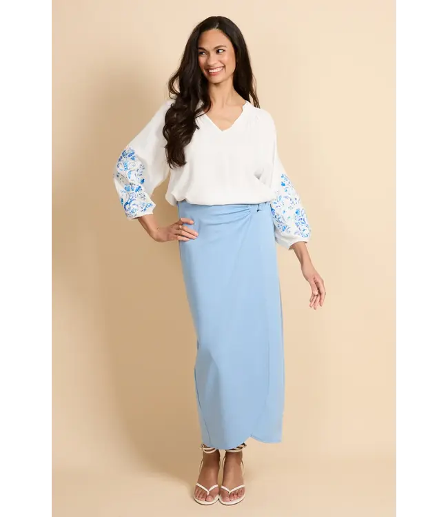 De Marilyn rok is een elegante midi rok met een vrouwelijke twist. Het model valt soepel langs het lichaam en wordt geaccentueerd door een subtiel geplooid detail met sierlijke ring op de heup. De gladde, licht stretchy stof zorgt voor een comfortabele pasvorm en een mooie, vloeiende valling. Perfect te combineren met een blouse of top voor een stijlvolle en verfijnde look, zowel overdag als ’s avonds.