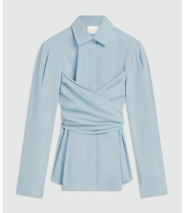 De JOSH V Luann dames blouse in de kleur Fresh Blue is een fitted model met lange mouwen. De blouse is gemaakt van stretch poplin met oragnisch katoen, polyester en elastaan. Het wrap-detail in de taille en de pofmouwen geven het ontwerp een elegante, vrouwelijke uitstraling. De lichtblauwe blouse is afgewerkt met goudkleurige logoknopen. Stylingtip: Draag de blouse met een high waisted rok en sneakers voor een casual-chique look of combineer met een pantalon en hakken voor een stijlvolle avondoutfit. De blouse is ook verkrijgbaar in de kleur Off White