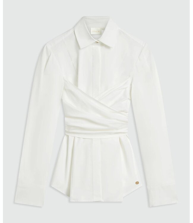De JOSH V Luann dames blouse in de kleur Off White is een fitted blouse. De blouse is gemaakt van stretch poplin met organisch katoen, polyester en stretch. Het elegante wrap-detail in de taille en de subtiele pofmouwen zorgen voor een vrouwelijke uitstraling. De blouse is afgewerkt met goudkleurige logoknopen. Stylingtip: draag de witte blouse met een pantalon of high waisted jeans voor een elegante look, of combineer met een rokje en hakken voor een avondoutfit.