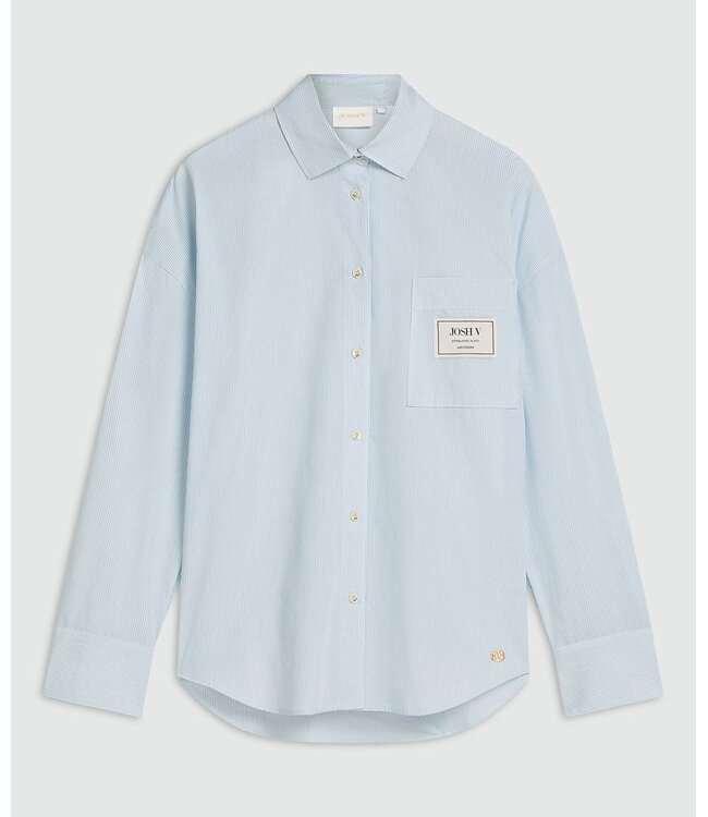 De JOSH V Neveah dames blouse in de kleur Fresh Blue Stripe is een oversized blouse met een yarn-dyed streeppatroon. De blouse is gemaakt van een comfortabele kwaliteit met gerecycled polyester en katoen, ingekocht via het Better Cotton Initiative (BCI™). De blouse sluit door middel van JOSH V branded knoopjes en is verijkt met een logo embleem op de borst. De blouse wordt geleverd met een bijpassende sjaal die je op verschillende manieren kunt stylen.