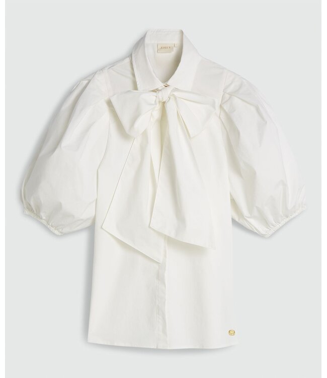 De JOSH V Sylviana dames blouse in de kleur Off White is een regular fit blouse met pofmouwen. De korte mouwen blouse is gemaakt van katoen, ingekocht via het Better Cotton Initiative (BCI™), gerecycled polyester en elastaan. De blouse heeft een knoopsluiting aan de voorkant en een afneembare sjaal bij de hals, die je kunt strikken naar wens of zonder strik kunt dragen. Stylingtip: combineer de blouse met een pantalon of shorts voor een elegante look, maar ook leuk te combineren met een jeans.