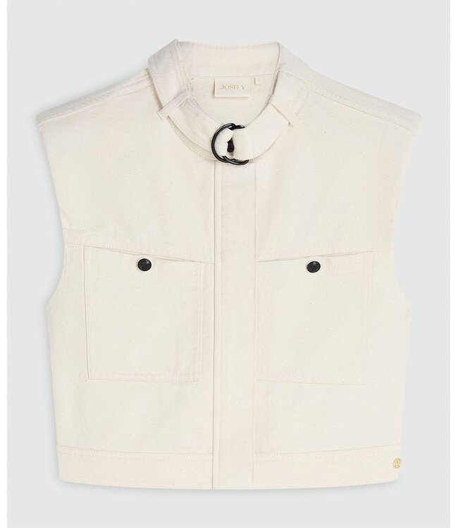 Het JOSH V Maxwell dames gilet in de kleur Ecru is een oversized, mouwloos gilet. Het gilet is gemaakt van 100% katoen, ingekocht via het Better Cotton Initiative (BCI™), met een subtiel twill-effect. De schoudervullingen en contrasterende gesp bij de kraag maken het gilet uniek. Door middel van een blinde knoopsluiting, sluit het jasje.