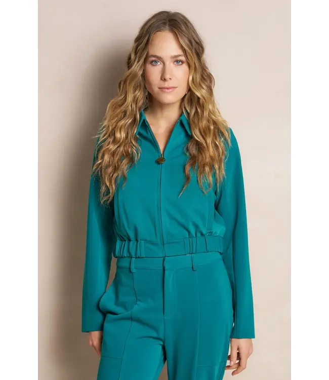 Blazer Lucie is een korte teal blazer met blousekraag en ritssluiting. De elastische tailleband zorgt voor een mooie aansluiting en accentueert het silhouet.