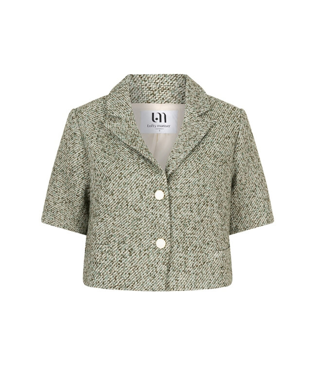 Blazer Marion is een korte blazer top gemaakt van tweed stof. De cropped blazer heeft een dubbele knoopsluiting en platte kraag. Je kunt de groene blazer als co-ord set dragen met short Desiree.