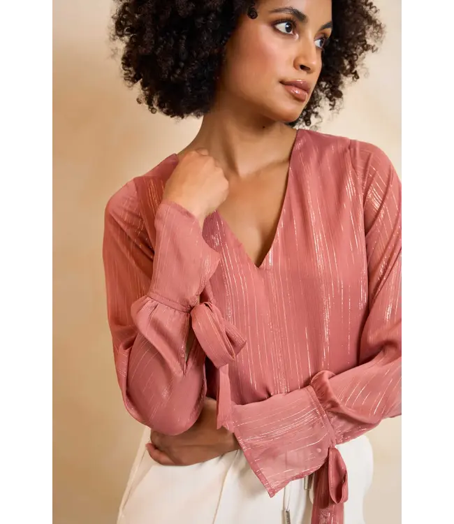 Blouse Lora is een mauve pink blouse met V-hals en lange mouwen. Het strikdetail aan de mouwuiteinden geeft een speelse touch, terwijl het lurex draadje subtiel glanst. De losvallende fit draagt comfortabel en is ideaal voor werk of een diner.