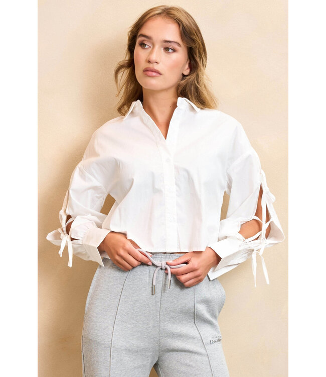 Blouse Rosy is een witte cropped blouse. De korte blouse heeft een klassieke kraag, knoopsluiting en strikdetail bij de mouwen. De witte katoenen blouse is qua pasvorm losvallend.