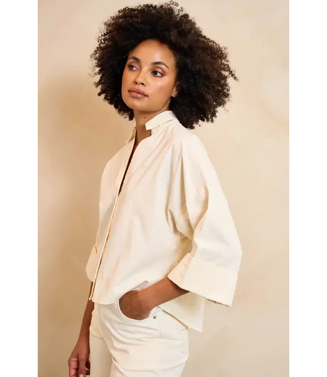 Blouse Selou is een ecru blouse met klassieke kraag en lange mouwen. De oversized pasvorm geeft een relaxte look en valt los om het lichaam.