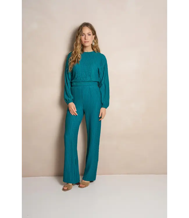 Broek Amaris is een teal broek met elastische tailleband en rechte pijpen. De stof bevat stretch voor extra comfort. De broek valt relaxed. Een veelzijdige broek die makkelijk te combineren is met tops en sweaters.