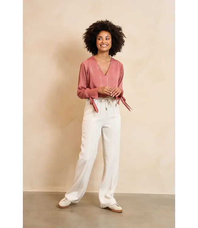 Broek Serin is een ecru straight leg broek met een elastische tailleband en koordsluiting. De gladde stof zorgt voor een rustige look, terwijl de losse pasvorm prettig draagt.