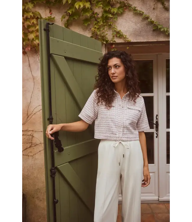 Top Ines is een ecru top met korte mouwen en een klassieke kraag. De borstzakken en knoopsluiting geven een clean accent, terwijl de rechte pasvorm zorgt voor een nette look.