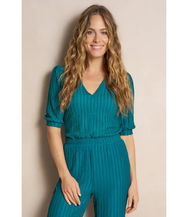 Top Zhara is een teal top met V-hals en korte pofmouwen. De licht getailleerde pasvorm sluit mooi aan zonder strak te zitten. De stof voelt soepel aan en bevat stretch voor extra comfort. Een stijlvolle top die geschikt is voor zowel werk als vrije tijd.
