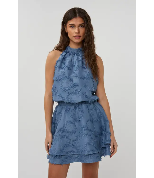 Het perfecte jurkje als je het ons vraagt! Een vrouwelijke hoge kraag en toch mouwloos. Dit jurkje is vrouwelijk en tegelijkertijd stoer door het denim jeans look materiaal met uitwerking. In het jurkje zit een elastische taille, die het figuur mooi accentueert.