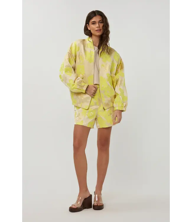 De Lola Short is gemaakt van een hele mooie zacht gele glanzende stof met bloemen patroon. De korte broek valt hoog in de taille, heeft twee steekzakken en een knoop- ritssluiting.